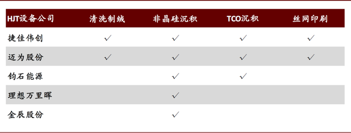 与PERC时代不同,在HJT时代,我们认为国产厂商无论在推动工艺改进还是设备降本方面,都起到了引领行业的作用。目前在设备端布局比较快的有捷佳伟创、迈为股份,以及钧石、理想万里晖、金辰股份等。其中,捷佳伟创分别于2020年5月30日、2020年11月23日与爱康科技、润阳集团达成异质结战略合作协议,未来有望在爱康6GW、润阳5GW量产线中提供全产线设备解决方案。迈为则在宣城开盛和通威金堂的招标中获得主要份额。