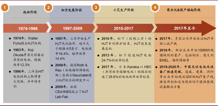 HJT电池的发展是不断提升转换效率和走向商业化的过程,具体可分为以下四个阶段: