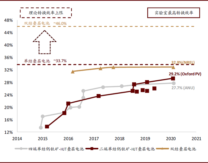 资料来源:《Adv. Energy Mater.》,《Prog. Photovoltaics》,中金公司研究部 注:NREL为美国可再生能源实验室,ANU为澳大利亚国立大学