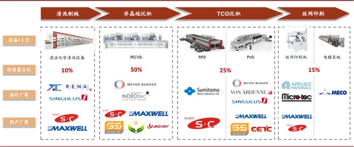 ►制绒清洗:采用与PERC相似的湿法化学清洗设备,但要求更高的刻蚀损伤层厚度以及在低温环境下处理。制绒清洗工艺包括RCA清洗法和臭氧清洗法,臭氧清洗法在满足工艺需求的同时,化学品耗量和废料处理成本更低,因此应用更广泛。制绒清洗设备以YAC、Singulas等国外厂商主导,捷佳伟创已顺利实现该环节设备的国产化,迈为股份也通过与参股公司江苏启威星(引进YAC异质结制绒清洗全套技术,并结合自有半导体湿法技术研发)合作的方式突破了HJT清洗设备,加入整线解决方案中。