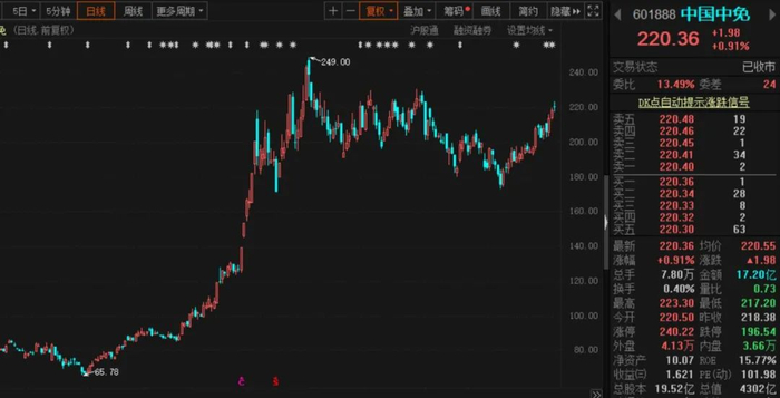 今年7月1日,海南离岛免税新政正式实施,在品类、件数、行邮税门槛三方面同时放宽。二级市场上,免税板块应声大涨,中国中免股价一度飙升至8月3日249元/股的高点,公司目前已回落至220.36元/股,但年涨幅仍高达约149%,总市值达4302亿元。