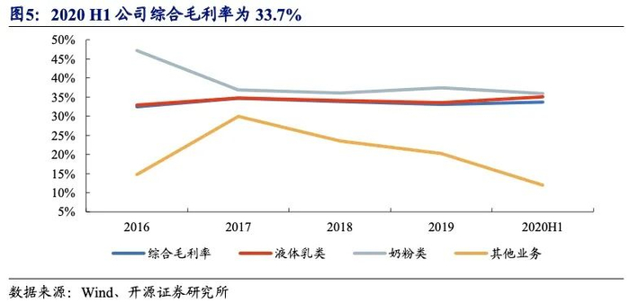 公司综合毛利主要由液体乳类业务贡献,毛利率整体走势与液体乳类业务毛利率走势基本一致。2020H1公司综合毛利率为33.7%,同比下跌0.82pcts,其中液体乳类业务毛利率为35.09%,同比下跌0.09pcts,奶粉类业务毛利率为35.94%,其他业务毛利率为11.97%。毛利率的下跌主要是受疫情影响,毛利率较高的订奶入户销售渠道收入占比下降。
