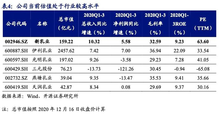 根据2019年年报,公司全年实现营业收入56.75亿元,同比增长14.14%;归母净利润2.44亿元,同比增长0.41%。2019年营收增长主要原因是公司实现中小板上市,募集资金投资项目顺利进行,以及公司持续进行产品结构优化,提高管理效率。归母净利润增长幅度低于营业收入的主要原因是原料奶价格上涨导致成本上升,同时公司为了提高品牌影响力,加大在营销宣传方面的投入。2020Q1-3公司实现营业收入46.57亿元,同比增长10.32%;归母净利润1.85亿元,同比增长3.70%;主要受益于疫情影响逐渐减弱,学生奶和送奶入户渠道不断恢复,以及低温鲜奶整体增长态势较好。