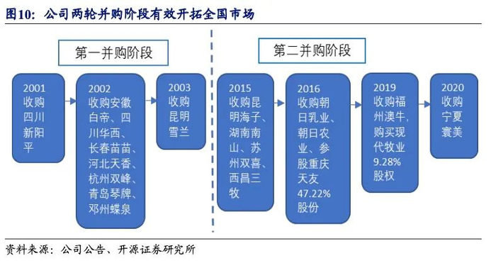 公司实行“1+N”并购战略进行全国化扩张,实现了以一家母公司、统一管理运营体系为改革创新核心主动力,为全国N个传统区域型赋能,并协同前进的共同体。2001-2020年公司一共进行过两轮并购阶段。在第一轮并购后,公司消除了亏损企业,完成了既定的经营目标;第二轮并购给公司带来盈利能力的显著改善。新乳业于2020年收购了宁夏寰美乳业,该企业处于中国奶源带,拥有一定规模的优质牧场,有望进一步提升公司在行业中的竞争实力。