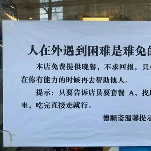 “人在外面遇到困难是难免的”,在北京德顺斋小店的玻璃上贴着这样一张纸,“本店免费提供晚餐,不求回报,只希望在你有能力的时候再去帮助他人”。这样的一份暖心餐,对应的是价值22元的红烧牛肉面。有吃过的网友称口味不错,面和肉的分量也都很足。没什么收入的大学生、流浪者和环卫工人,是这份套餐想要帮助的目标群体。
