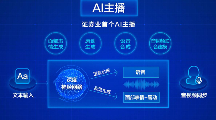 所谓AI主播,顾名思义,指的是使用“自然交互+知识计算”等多模态虚拟人物生成技术,模拟出一个类似人类的虚拟主播,来完成任意文本内容的视频播报或交互。广发证券的“小田”,就是以广发证券员工为原型,结合录制该员工的多条音频和视频记录,经过长达2个月的细致模型训练融合后生产上线的。最终上线的AI 主播“小田”,外形与其人物原型高度相似,在声音、微表情方面也高度保真了原型特点。