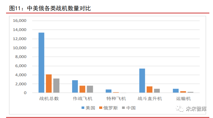 根据《飞行国际》发布的《WorldAirForce2019》,我国现有各类战机总数 3187 架,美国各类战机总数 13398 架,俄罗斯各类战机总数 4078 架。其中我国作战飞 机 1624 架、特种飞机 97 架、战斗直升机 902 架、运输机 193 架;美国作战飞机 2826 架、特种飞机 759 架、战斗直升机 5429 架、运输机 940 架;俄罗斯作战飞机 1591 架、特种飞机 125 架、战斗直升机 1448 架、运输机 401 架