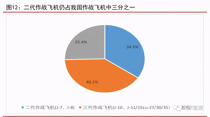 我国仍有三成比例作战飞机是二代作战飞机。这里作战飞机包含有战斗机、战 斗轰炸机、强击机、战略轰炸机等装备有进攻性武器系统的固定翼战机。我国作战 飞机中,有 J-7、J-8 二代作战飞机 561 架,占我国作战飞机比例高达 34.5%;三代 作战飞机 J-10 有 260 架、J-11/15su-27/30/35 有 391 架,合计 651 架,占我国作 战飞机比例为 40.1%。美国作战飞机基本上是三代以上作战飞机,并拥有四代作战 飞机 F-22 178 架,F-35 214 架。二代作战飞机已经不适合现代战争,随着我国第 三代作战飞机日趋成熟,新型战机歼-16,歼-10c 以及五代隐身战斗机歼-20 的相 继服役,未来二代作战飞机将逐渐退役。