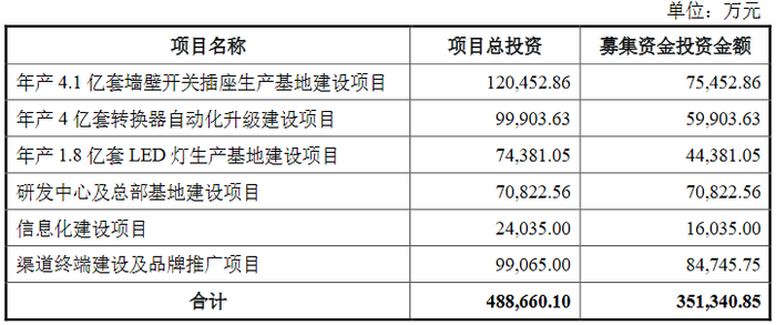 今年2月初,公牛集团在上交所主板上市,首次公开发行股票计划募资35.13亿元,分别投向6个项目,其中,年产1.8亿套LED灯生产基地建设项目总投资7.44亿元,拟使用募资金额4.44亿元。