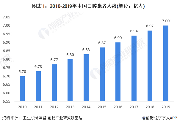 我国近年来口腔疾病患者人数呈增长态势。2018年我国患有口腔疾病的人数约为6.97亿人,初步估计2019年我国口腔患者人数达到7亿人,表明全国已有超过50%的人患有口腔疾病。