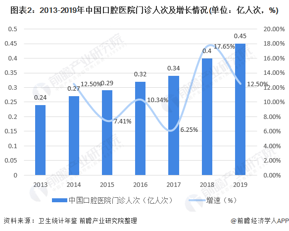 由上表可知2018年我国患有口腔疾病的人数约为6.97亿人,然而据统计2018年口腔医院诊疗人次仅为4000万人左右,诊疗人次占口腔患者的比例约为5.76%。