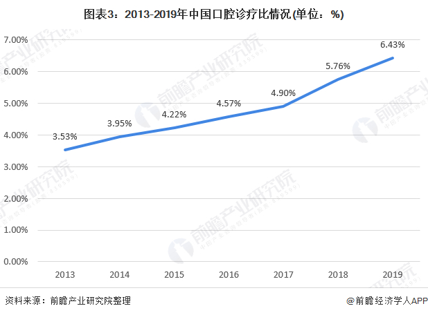 尽管我国局面口腔保健意识和口腔健康水平仍偏低,但随着居民收入水平的提高和健康意识的不断增强,近年来我国口腔患者诊疗人次所占比例呈逐年上升趋势。从诊疗比看,2019年口腔医院诊疗人次占口腔患者的比例约为6.43%,未来仍有很大的提升空间。