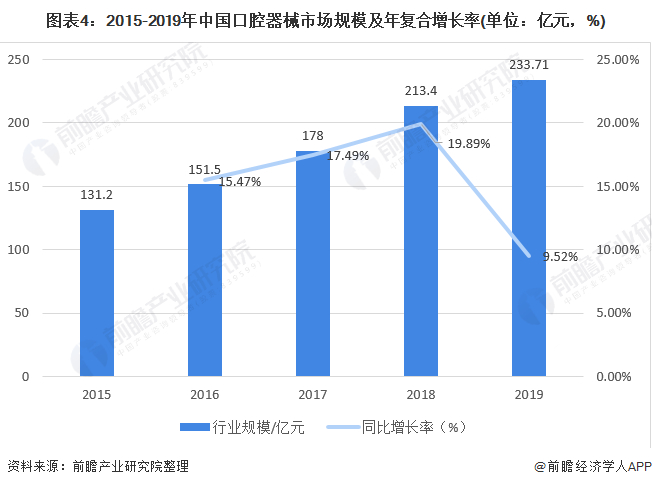 近年来我国口腔器械市场规模呈不断增长的趋势,2019年我国口腔器械市场规模达233.71亿元,较2018年的213.44亿元增长9.50%,2015-2019年复合增长率为15.53%。