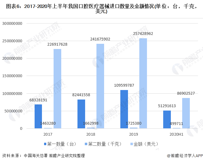2019年我国口腔医疗器械进口数量约1.1亿台,共172.54吨,进口金额达2.57亿美元。2020年上半年,我国口腔医疗器械进口数量为0.51亿台,共49.97吨千克,进口金额为8690.25万美元。