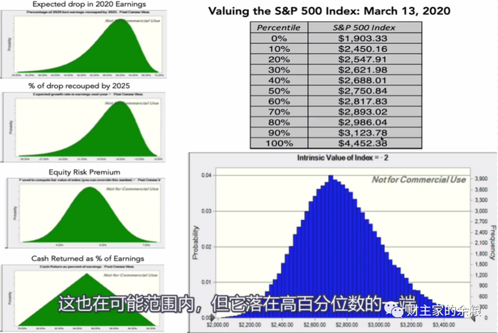 例如,就在危机最严重的3月18日,达摩达兰对于标普500指数进行了估值,考虑到疫情影响、现金回报、风险溢价等情况,他认为当时的标普估值,中位值应该在2750附近,而最高不应超过4452点,最低不应该低于1903点。