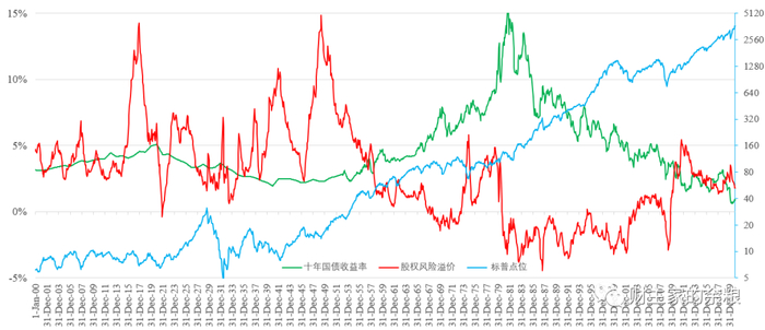 最后,送给大家一幅120年来标普500指数的风险溢价率和国债收益率图,大家慢慢体会。