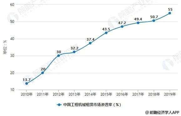 未来5-10年,随着中国固定资产投资规模增速不断放缓(但整体增速应该还是正的),工程机械行业的营业收入也会趋于平稳。就此,也给机械设备租赁行业也带来了新的机遇。目前,中国工程机械租赁市场渗透率仅约为55%左右,按照欧美发达国家80-90%的渗透比例计算,较现在依然有50%以上的增长空间。