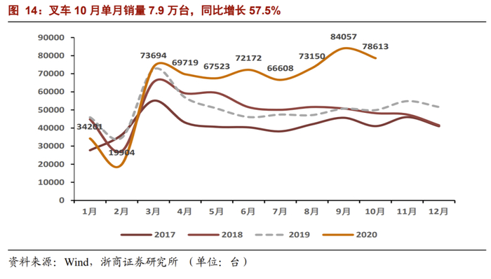 目前,国内叉车保有量达300多万台,但依然不能满足市场巨大的需求。这些年国内叉车行业一直保持着高速发展,今年更是出现加速增长:2020年1-10月国内叉车销量约64万辆,同比增长27.4%;其中6-10月增速显著提升,平均增速达约55%(下图)。