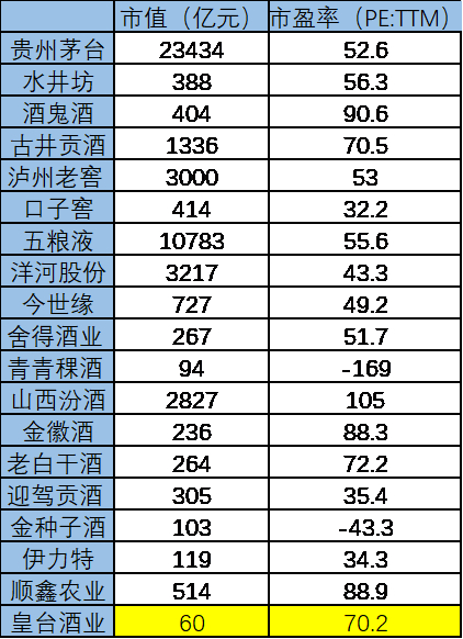不算刚刚将红星二锅头收入囊中的大豪科技,A股市场共有19只白酒股。虽然皇台酒业以60亿市值排在最末,但从市盈率来看,高达70.2的市盈率已经位于行业第二梯队,仅次于酒鬼酒、金徽酒、顺鑫农业等少数几家。