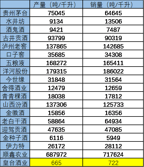 但是皇台酒业的规模早已被竞争者们抛在身后。数据显示,2019年产销量最高的顺鑫农业生产量和销售量已经分别达到6.88亿升(约合68.8万吨)和71.8亿升(约合71.8万吨),其余大部分已经突破万吨规模。而皇台酒业去年五月才恢复生产,当年产销量分别只有665吨和722吨。