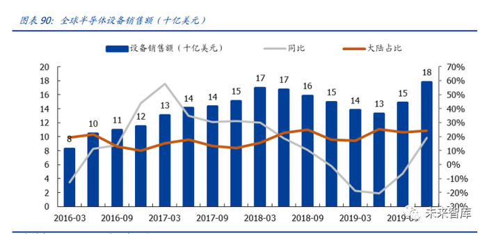 根据 SEMI,2019Q4 半导体设备销售额 178 亿美元,同比增长 19%,环比增长 24%, 单季度半导体设备销售额创历史新高。按地区分布,贡献最大的分别是中国大陆(同比 增长 59%)、中国台湾(同比增长 121%)。