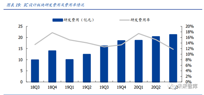 板块单季度研发费用绝对值仍维持在 20 亿元以上,但研发强度有所下降。IC 设计板块 20Q3 整体研发费用为 21.2 亿元,创历史新高,研发费用率则有所下滑至 12%。我们预 计研发强度下降主要原因为疫情期间新品研发、流片进度收到影响所致,此外也有一部 分公司收入增速大幅超过研发费用增速。