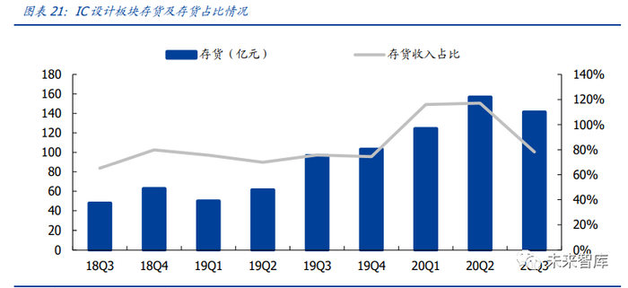 存货占比大幅下降,去库存效果显著,存货拐点显现!相当值得关注的一个指标是,IC 设计板块存货占比指标在 20Q3 大幅下降,反应此前重复下单(over-booking)的存 货在三季度得到显著去化,同时我们跟踪韦尔股份、兆易创新、澜起科技等龙头公司来 看也确实存在这一趋势。Q4 起存货拐点显现,景气趋势有望上行!