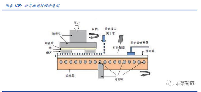 CMP 包括三道抛光工序,主要运用到的材料包括抛光垫、抛光液、蜡、陶瓷片等。不同 工序根据目的的不同,分别需要不同的抛光压力、抛光液组分、pH 值、抛光垫材质、结 构及硬度等。CMP 抛光液和 CMP 抛光垫是 CMP 工艺的核心要素,二者的性质影响着 表面抛光质量。