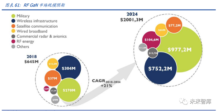 RF GaN 复合增速为 22%,下游应用领域以军工、基站为主。根据 Yole,RF GaN 市场 会从 2018 年的 6.45 亿美元增长至 2024 年的 20.01 亿美元,复合增速为 21%。从应用 结构上看,2018 年分别为基站 3.04 亿美元、军工 2.70 亿美元、卫星通信 0.37 亿美元。