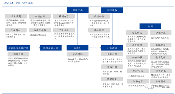 持续关注中国“芯”阵列核心标的,如晶圆代工、封测、IP 授权及设计服务、设备材料 等国产化机会。中芯国际科创板上市,A 股国产半导体家族再得一名大将。随着当前国 产半导体板块的日渐完善,我们已经看到从 IP 授权及设计服务、设计、晶圆代工、封测、设备、以及材料多领域的不同程度的国产化出现。