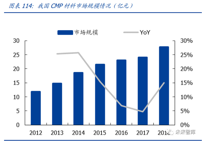 随着半导体市场不断复苏增长,在半导体芯片制程不断提高的同时,对于晶圆制造环节 中的 CMP 的价值量也是不断的增加的。