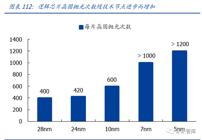 从 2D NAND 至 3D NAND 的升级之中,CMP 抛光步骤根据 Cabot Microelectroncs 的测 算,抛光步骤也从原来的 6.4 提升至 13.6,超过 100%的步骤增长;另一方面对于逻辑 芯片制程的提高,单片晶圆的抛光次数也从 28nm 所需要的约 400 次提升至 5nm 的超 过 1200 次。随着抛光次数及抛光时长的增加,作为耗品的 CMP 抛光液及抛光垫的使用 都将呈现快速增长的趋势。