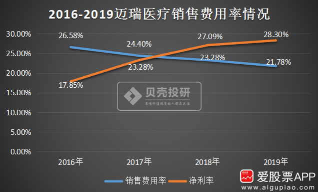 据2016-2019数据,迈瑞医疗的销售费用率确实是逐渐下降的,且公司的盈利能力也得到了稳步提升。