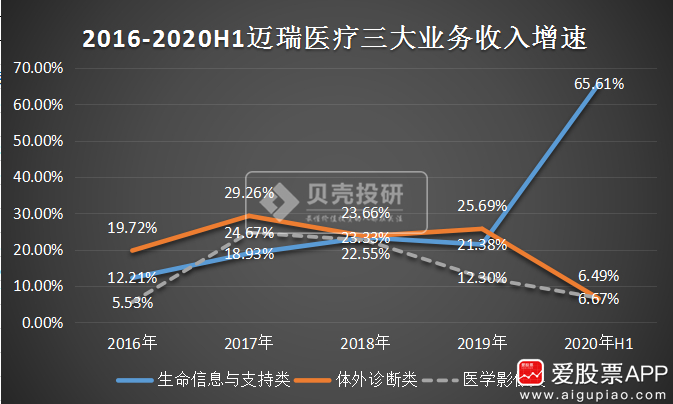 近几年,迈瑞医疗的三大产品线均能维持稳定快速增长,2018年、2019年生命信息支持类产品和体外诊断产品均维持了20%以上的收入增速,而2019年在彩超行业整体增速放缓的情况下(行业增速为6%),迈瑞医疗的医学影像类设备仍然维持了12.3%的增速。