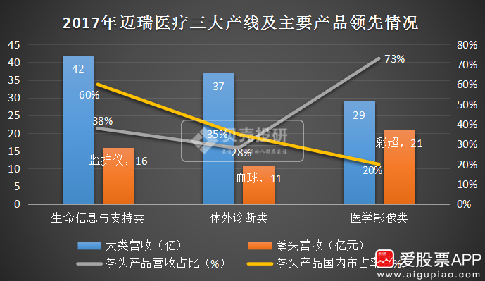 以监护仪起家的迈瑞,如今已拥有生命信息与支持类、体外诊断类、医学影像类三大成熟产线,各产线中都有能震慑行业的拳头产品。据统计,2017年,迈瑞医疗的监护仪、血球仪、彩超在国内的市占率分别达到了60%、35%、20%,分别位列行业第一位、第二位和第三位,达到了国际技术领先水平。