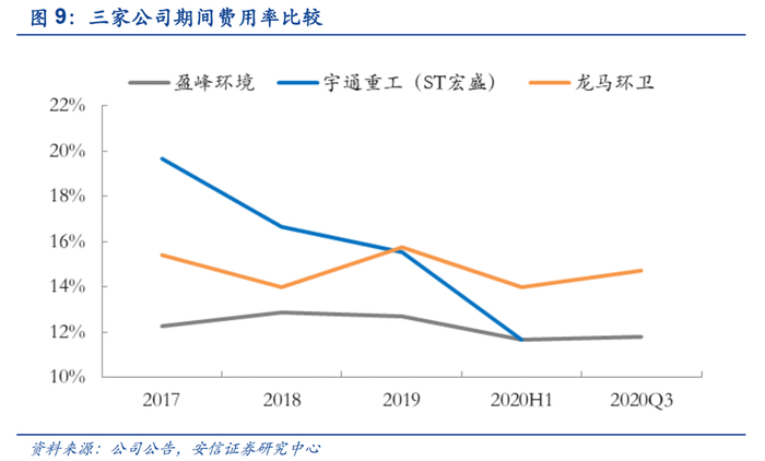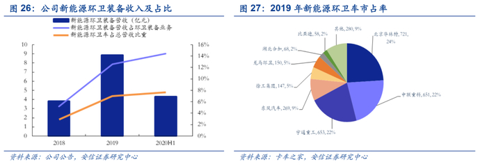 ■环卫装备行业翘楚,赋能环卫服务助推企业后来居上。公司对智慧环卫装备的研发投入和技术创新能力在行业领先。经过多年来的发展,公司下设有 64 家分公司、逾 300 个运营中心,产品型号超过400余款,建立了全国最完善的环卫和环境产业链。公司率先形成融合“智能装备、智云平台、智慧服务”的智慧环卫体系,互联网、物联网联合推动环卫高效精准化。同时,公司新能源环卫车占比大幅提升,根据公司公告和公众号,2019年该板块营收同比增长130.7%,市占率位居行业第三,今年前三季度销量和营收已跃居行业第一。