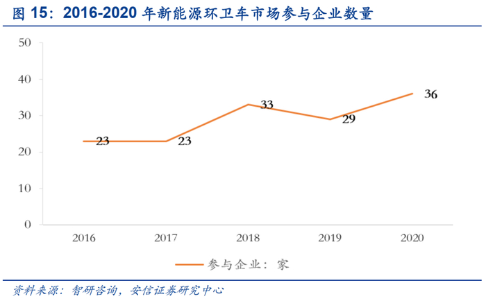 相对环卫装备行业,新能源环卫车市场的市场集中度更高。据卡车之家统计,2020年参与新能源汽车生产的企业共36家,自2018年以来并未有明显的增加。2019年新能源环卫车市场CR3市占率高达67.6%,CR10市占率为94.8%。据前瞻产业院统计,2019年我国环卫车行业共有275个企业从事环卫车生产,CR3市占率为40%,CR10市占率为62.6%。对企业研发技术水平的更高要求和企业是否具有提前布局新能源环卫车的战略眼光是造成当前新能源环卫行业市场状态的两大重要原因。