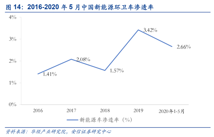 政策驱动下,新能源环卫车辆采购量增长明显,渗透率增长未能同步。据卡车之家数据,2019年新能源环卫车产量为4445辆,同比大幅增长192%;据龙马环卫2020年上半年报告显示,截至 2020 年 6月 30 日,我国新能源环卫车销量1526 台,同比增长 49.61%,占我国环卫车总销量的 2.52%。然而在销量迅速增长的同时,新能源环卫车的渗透率并未迅速抬升。2016年新能源环卫车渗透率为1.41%,至2020年5月,渗透率波动上升至2.66%。
