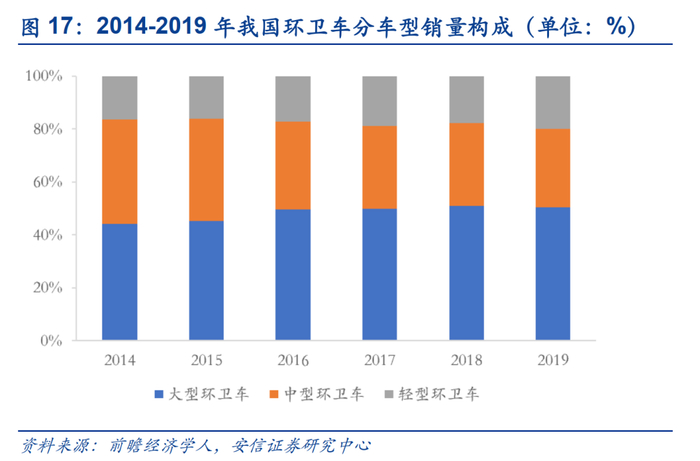 环卫装备行业属于改装行业,具有较高的技术壁垒、资金壁垒和资质壁垒。我国环卫装备行业正处于第二个发展阶段——基本环卫装备阶段,即机械化作业率达到60%。2018年7月,国务院印发《打赢蓝天保卫战三年行动计划》,提出大力推进道路清扫保洁机械化作业,提高道路机械化清扫率,要求2020年底前,地级及以上城市建成区达到70%以上,县城达到60%以上,重点区域要显著提高。机械化率仍有提升的巨大空间。此外,由于环卫车折旧年限一般在5-10年,环卫车更替市场也仍存在潜力。