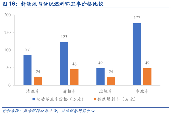 电池成本与技术提升有望推动整车价格下降。目前电动环卫车生产成本主要集中在:底盘+电池+各分系统电器+上装,电池、底盘和上装成本在整车企业装配过程中占主要部分。对比传统汽油环卫车的底盘、发动机和上装成本,电池成本成了新能源环卫车成本控制中不可忽视的一环。从动力电池研发生产情况以及《新能源汽车推广应用推荐目录》的电池配套情况来看,目前新能源电动车的动力电池主要是铅酸蓄电池、三元锂离子电池和锰酸锂电池。目前新能源环卫车主要以纯电动环卫车为主,后者底盘主要采用的是磷酸铁锂电池。