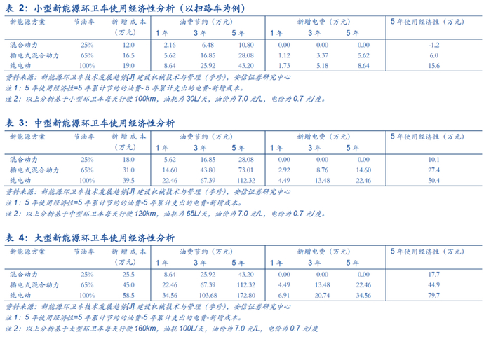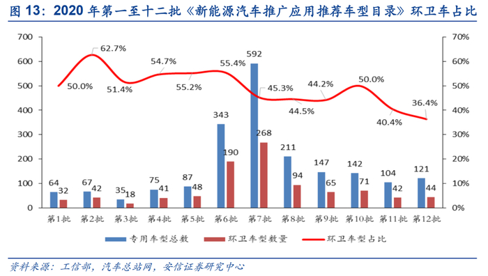 ■环卫装备机械化释放需求,政策加码环卫车新能源化发展。作为公共领域车辆的重要组成部分,新能源环卫车在政策推动下加速发展。2020年以来工信部发布的十二批《新能源汽车推广应用推荐车型目录》中,新能源环卫车入选均占比维持在40%以上,保持绝对的领先地位。当前新能源环卫车渗透率较低,根据华经产业研究院统计数据, 2019年新能源环卫车渗透率仅为3.42%。新能源环卫车的市场放量主要来自于环卫车机械化率提升带来的环卫车辆需求以及政策上对新增与更替环卫车电动化的需求两个方面,我们预计中性情况下2025市场预计可以接近400亿。