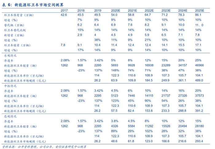 我们预计2020-2025年新能源环卫车渗透率将随着政策推动稳步提升。乐观情况下我们假设2025年新能源环卫车渗透率将达到25%,则预测到2025年新能源环卫车市场空间489亿;中性情况下,我们假设2025年新能源环卫车渗透率将达20%,则预测到2025年新能源环卫车市场空间391亿;悲观情况下,我们假设2025年新能源环卫车渗透率将达15%,则预测到2025年新能源环卫车市场空间293亿。