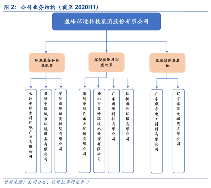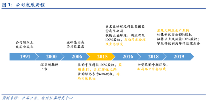 盈峰环境公司前身是创办于1974年的上虞风机厂,自2000年在深交所挂牌上市,主要业务为风机与电磁线制造。2003年,公司开始承接环境工程,初步涉足环保领域。2015年,公司完成了对宇星科技100%股权的收购,高起点切入了环境监测行业;同年,公司收购了深圳绿色东方环保51%的股权,从事固废处理业务,自此公司进军环保行业。2016年,公司收购亮科环保55%股权、大盛环球以及明欢有限100%股权,积极布局水环境治理业务,逐步构建包括环境监测、环境治理、垃圾焚烧、污水处理、污水治理在内的环保大平台。2018年,公司以152.5亿元收购中联环境100%股权,布局环卫装备领域。自2019年6月,公司主营业务战略性转变,产业聚焦至包括智能装备与智能服务在内的环卫体系。