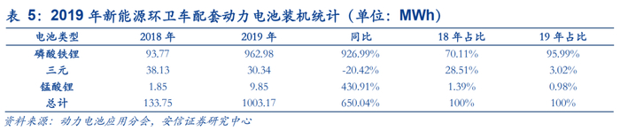 根据动力电池应用分会数据,2019年磷酸铁锂电池在新能源环卫车上的装机量为962.98MWh,同比大增926.99%,占比高达95.99%;三元电池装机量为30.34MWh,同比下降20.42%,占比3.02%;锰酸锂装机量9.85MWh,同比增长430.91%,占比0.98%。磷酸铁锂技术成熟稳定和较三元电池有明显的成本优势两个原因是促使2019年磷酸铁锂电池装机量占比同比增加25%的主要原因。目前,磷酸铁锂电池的质量能量密度已经达到《2020年新能源汽车推广补贴方案及产品技术要求》中的要求,即高于125Wh/kg。相较于三元锂离子电池,磷酸铁锂电池还具有安全性高、循环寿命更长的特点,对具有公共事业属性的环卫装备行业而言,这两个优点具有较强吸引力。成本方面,由于磷酸铁锂电池没有贵重金属,因而生产成本较低。根据电池中国网数据,磷酸铁锂电芯价格已经可以做到0.6元/Wh左右,而三元电芯价格仍在1.0元/Wh附近,并且随着原材料价格降低及或有技术的突破下,磷酸铁锂电池成本仍有下行空间。宁德时代新能源科技有限公司董事长曾毓群 2019 年 7 月 2 日在世界新能源汽车大会演讲中称,动力电池系统能量密度在 2025 年可以达到 250Wh/kg,价格可以做100 美金,也就是 700 元不含税。目前,动力电池价格为 950—1150 元/wh。我们认为未来动力电池成本有望逐渐下降,推动新能源环卫车的整车价格持续下降。