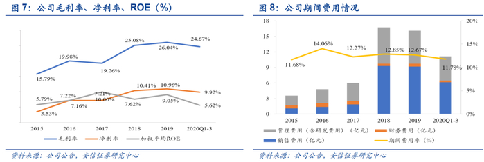 毛利率净利率稳步上升,期间费用率整体呈下降趋势。2019年,公司毛利率、净利率、加权平均ROE分别为26.04%、10.96%、9.05%,期间费用率为12.67%,同比下降0.18个百分点。2020年前三季度,公司毛利率为24.67%,同比增长0.35个百分点;净利率为9.92%,同比轻微下降1.34个百分点;期间费用率为11.78%,同比下降0.51个百分点,其中,销售费用率6.59%,同比下降0.53个百分点。财务费用率0.35%,同比下降0.08个百分点,管理(含研发)费用率4.94%,同比下降0.35个百分点。相比于同行业可比公司龙马环卫与宇通重工,公司期间费用率显著体育同行。