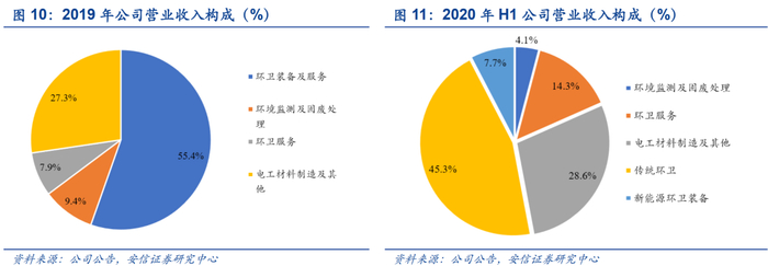 环保产业的核心地位逐步稳定。根据公司2017年-2020年中期报告,自2018年公司并购中联环境后,环卫装备与服务跃居为公司的第一大核心业务,目前占比达到60%以上。其中环卫装备2019年占比达到55.4%,2020年上半年占比达到53%;环卫服务2019年占比达到7.9%,2020年上半年占比达到14.3%。此外,环境监测与固废处理在2019年占比9.4%,2020年上半年占比4.1%。