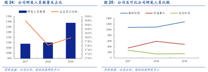 研发人员数量提升,为后续科技创新增添动力。根据公司公告,公司从2017-2019年研发人员数量从1086人增长至1286人,大幅领先同行业可比公司龙马环卫与宇通重工。同时公司研发人员数量占比稳定在17%以上。