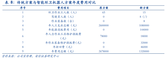 智能环卫机器人削减成本50.7%。2019年10月15日,中联环境在智能环卫机器人产品发布会上推出7款智能小型环卫机器人用于解决城市“毛细血管”的环境治理问题。公司以长沙市某项目为例,测算采用传统方案和智能机器人方案的成本差别。该项目若采用传统纯人力清扫方案需要环卫作业人员65名,而新方案引入智能小型环卫机器人装备作业,需要设备8台,8名驾驶员以及15名环卫作业工人。在计算人工支出、能耗、工具维护损耗费、设备折旧费等费用支出后,可得出,传统方案年费用总额为267.8万元,新方案为132万元,相比原方案,作业人员队伍精简64.6%,年度总费用投入消减50.7%。会上,公司就已与东莞家宝、侨银环保、玉城环境等10家企业签订订单合同,成功销售订单7000万元。