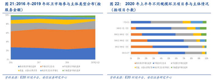 物业公司强势涌入环卫领域,市场参与主体多元化。物业与环卫行业均为劳动力密集型行业,且前者保洁服务以及垃圾转运等业务内容与环卫行业业务具有很强的重叠性,因此物业公司的转型具有天然优势和较低的进入门槛。根据E20研究院数据,自2017年环卫市场化加速以来,物业龙头公司如碧桂园、雅居乐、保利物业、招商局物业等纷纷跳出“墙外”,通过公开竞标等方式入局环卫市场,给传统环卫企业带来诸多压力,自2020年以来,其战略性延伸愈演愈烈。2020年上半年,物业行业中标环卫项目数量近 2000 个,占比20%。从项目总金额来看,当前物业公司仍主要以承担小型项目为主,主要分布在500万元以下的项目,内容则主要是环卫服务的前端和中端为主——道路清扫保洁、垃圾清运。尽管地方物业公司对传统环卫企业的冲击形式并不明显,但是近年来物业龙头公司均加力深耕环卫服务领域,向全产业链布局,如万科物业“物业城市”模式在横琴新区试水,城市服务在厦门鼓浪屿落地;碧桂园服务推出“城市共生计划”以及龙湖物业在两江新区探索“城市管家”等。由于我国的物业公司常常背靠大型地产企业,资金实力不俗,并且综合管理能力较强,在逐步适应从封闭空间到开放性场地的公共卫生管理模式后,其整合城市公共空间、公共资源、公共项目为“大物业”将逐渐增强,对传统环卫企业的冲击也将增大。