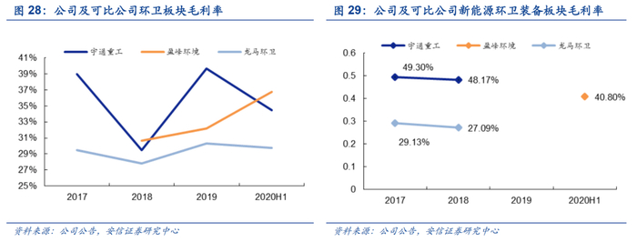 环卫装备板块毛利率大幅提升。根据公司公告,公司2018-2020H1环卫装备板块毛利率分别为30.67%、32.18%和36.75%,已于2020年上半年超过宇通重工和龙马环卫。同时,公司新能源环卫装备毛利率超40%,拉升环卫装备板块整体毛利率,未来受益于规模效应毛利率有望进一步提升。
